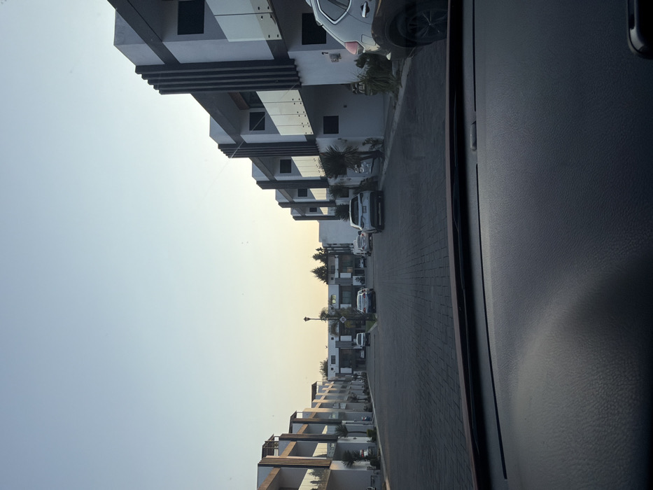 A street scene viewed from inside a vehicle. Modern buildings line the street, with parked cars visible. The road surface is paved with bricks. The sky is clear, suggesting either early morning or late afternoon. The inside of the car, including the dashboard and part of the windshield, is visible, framing the external scene. The perspective is slightly tilted, as the image is captured from an oblique angle.