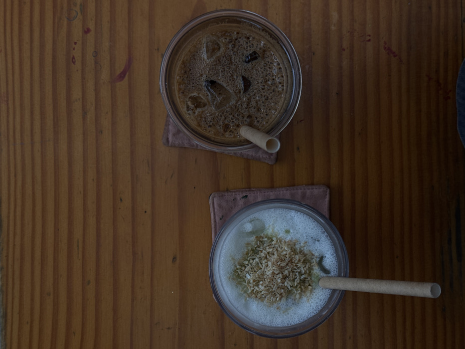 - "An overhead view captures two beverages positioned on a light brown wooden table, composed of horizontal planks, consistent with a setting in Ngũ Hành Sơn Ward, Vietnam" by FM-7ilHf1, licensed under CC BY 4.0