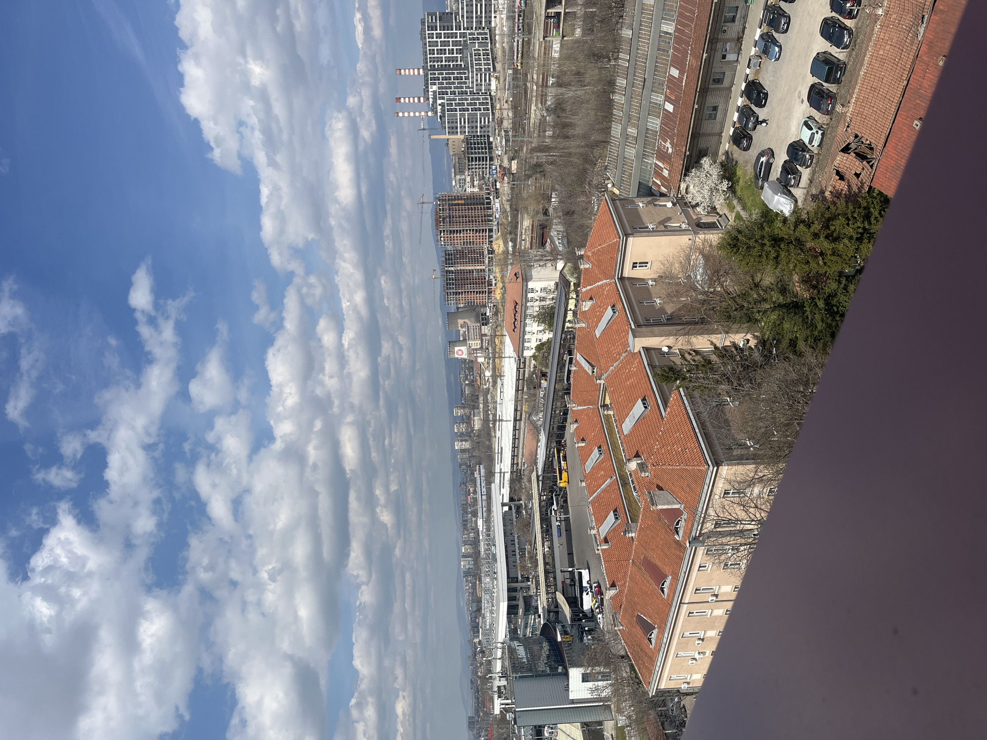 An elevated, wide-angle daytime photograph captures an urban landscape in Sofia, Bulgaria, centered on the area of the Central Bus Station and Central Railway Station. The sky is bright blue with scattered cumulus clouds. In the immediate foreground, the top edge of a dark reddish-brown structure, likely a balcony railing or roof, occupies the bottom portion of the image. The mid-ground features a large, L-shaped, four-story building with a light beige facade and a prominent terracotta tiled roof system, incorporating multiple dormer windows, some arched and some rectangular. Numerous white-framed windows and exterior air conditioning units are visible on its walls. Adjacent to this building, a paved parking lot holds approximately fifteen parked passenger vehicles of diverse makes and colors. A solitary individual is discernable walking through this parking lot. Several deciduous trees, bare of foliage, and a few evergreen trees are interspersed around the buildings, with one small white-flowering tree visible near the parking lot. To the right of the L-shaped building, a long, low-rise structure with a rusted corrugated metal roof is present, resembling a warehouse. Beyond these structures lies the expansive Central Bus Station, characterized by its modern, multi-level architecture with a white roof and extensive glazing. Multiple intercity buses (white and yellow) are parked at its bays, and several smaller vehicles are on the surrounding access roads. Directly behind the bus station are the extensive railway tracks and platforms of the Central Railway Station. The background reveals a dense cityscape comprising a mix of residential and commercial buildings. Several multi-story buildings are under construction, indicated by their exposed concrete frameworks and visible construction cranes. Further in the distance, a large industrial complex with three prominent red-and-white striped smokestacks and cooling towers is visible. Distant mountain ranges outline the horizon under the partly cloudy sky.