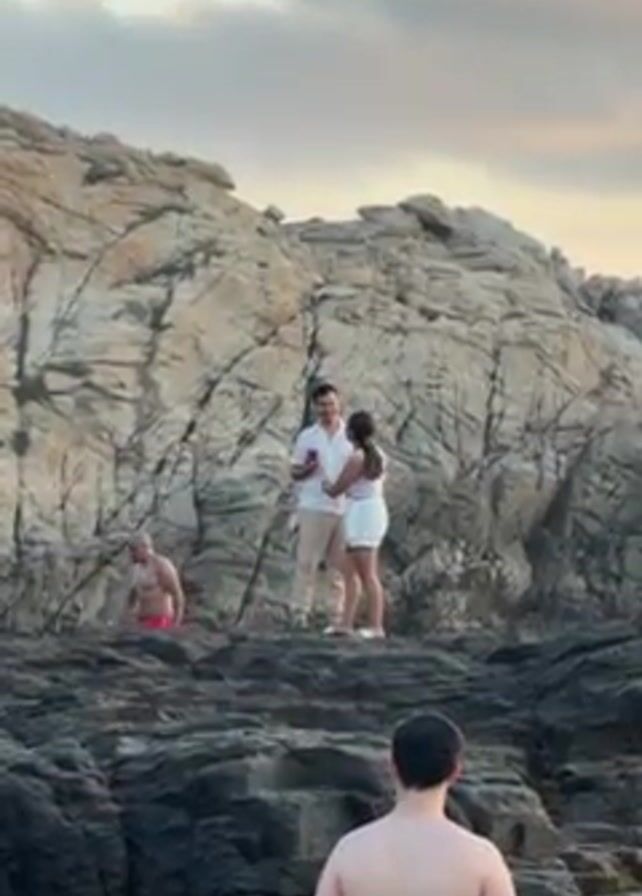 rocky beach landscape. In the foreground, a shirtless man wearing patterned swim trunks stands with his back to the camera. On a higher rock formation in the middle ground, a couple is embracing. The man in the couple is wearing a white shirt and khaki pants, holding a red can, while the woman wears a white dress. Behind and to the left of them, another man stands shirtless in red swim trunks. The backdrop features a large, light-colored rocky cliff beneath a cloudy sky.