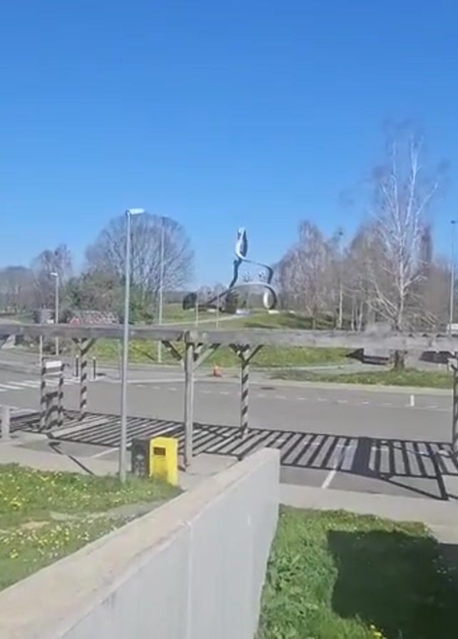 roundabout in a rural area with a modern art sculpture in the center