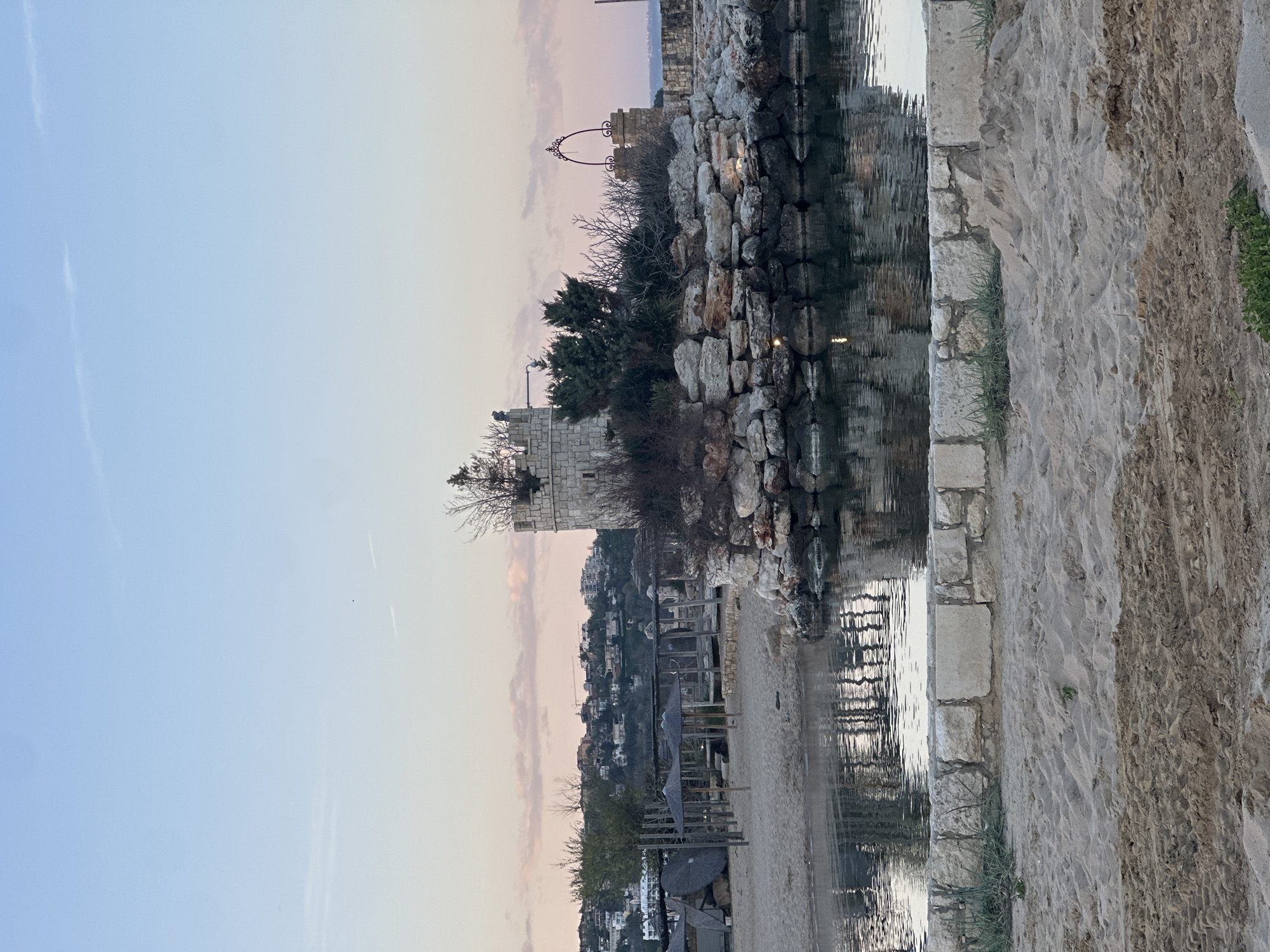 coastal scene in Varna, Bulgaria, taken at dusk. The foreground features a stone wall on the right, bordering a sandy beach area. To the left of the beach is a stone quay composed of boulders and stones. There are several sun umbrellas and a wooden structure on the beach. A stone tower stands on the quay, adjacent to some small trees and brush. In the background, a residential area with buildings and vegetation slopes upward. Above the quay is a decorative metal arch. The sky is pastel shades of blue and pink. The water reflects the sky and the elements along the quay.