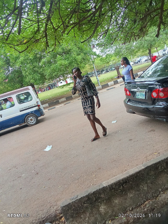 A woman wearing a patterned dress and sandals is walking on a road while talking on a cell phone. A van is driving in the opposite direction, and a black car is parked nearby. Another woman is walking behind the parked car, holding a notebook. The area appears to be a public space with trees and green spaces. A date stamp indicates "02/10/2026."