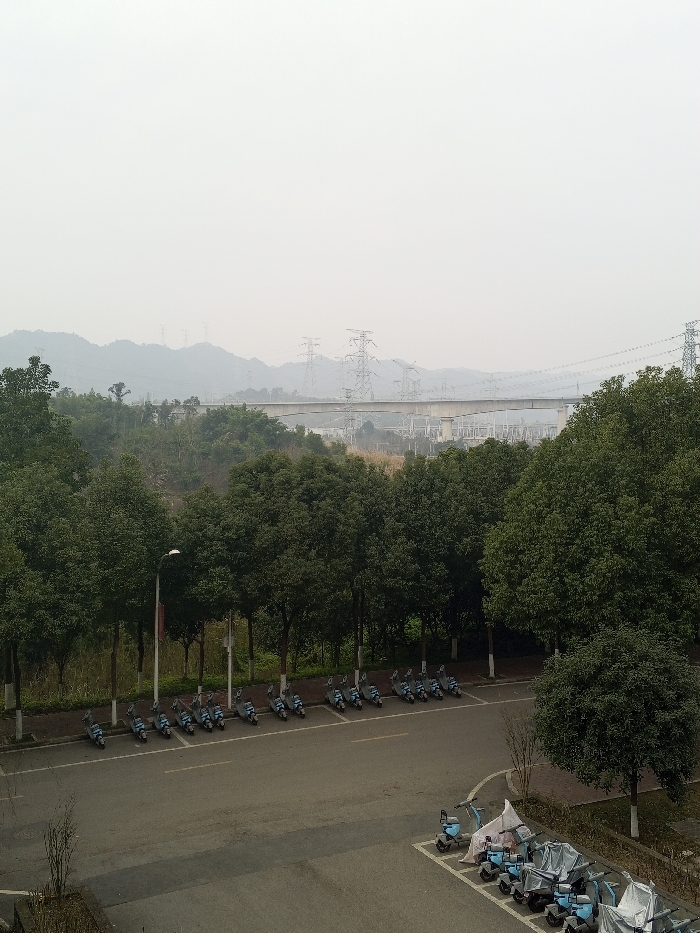 A row of mopeds lines the side of an empty road. In the distance is a long bridge extending across a valley, with a mountainous landscape behind it. Multiple power lines and pylons are also visible in the distance, set against a hazy sky. The scene is bordered by tall, green trees. Another row of mopeds is visible in the foreground, some covered with protective wraps.