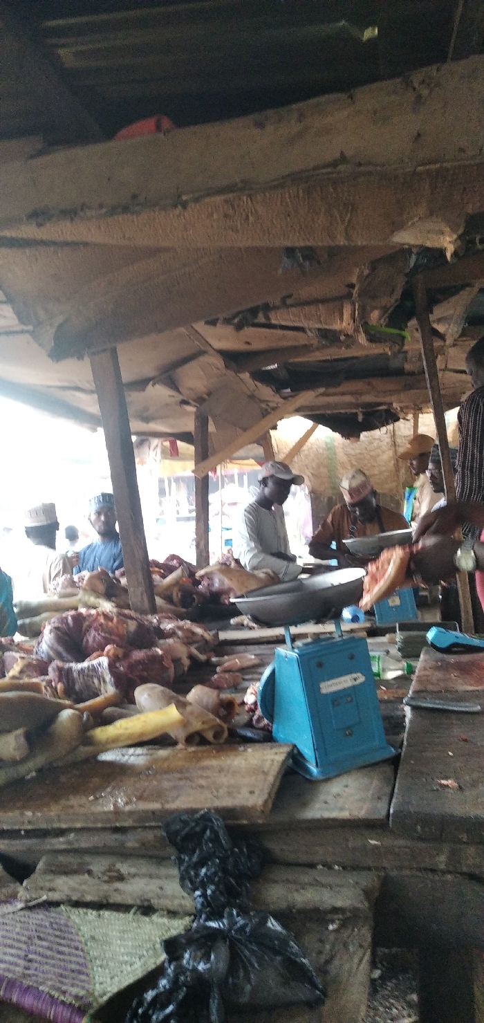 This image captures a bustling butcher's stall within a market environment in Zaria, Nigeria