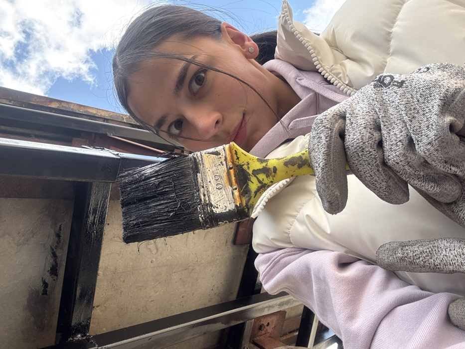 An outdoor, eye-level photograph captured in Gabrovo, Bulgaria, depicts a young female engaged in painting. The subject, visible from the chest upwards, has dark hair and wears a light purple hooded sweatshirt under a cream-colored puffer vest. Her hands are clad in grey, textured work gloves. She holds a wide paint brush with a yellow handle, heavily laden with black paint, positioned prominently in the foreground. Her gaze is directed towards the camera with a direct, slightly quizzical expression. In the background, an architectural structure consisting of metal beams and concrete elements is visible, some of which exhibit fresh black paint. The upper right quadrant of the image shows a blue sky with scattered white clouds, indicating clear daytime conditions.