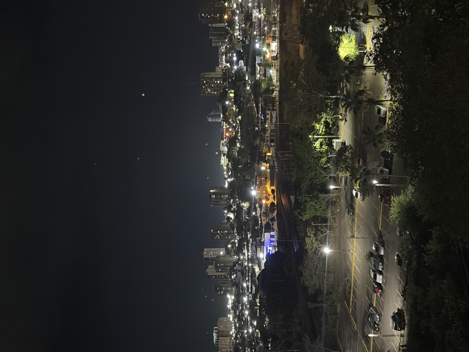 The image depicts a nighttime panoramic view of Ciudad Guayana, Venezuela. In the immediate foreground, an illuminated asphalt parking lot is visible, containing approximately two dozen parked passenger vehicles of various colors (e.g., white, silver, black, red, grey), delineated by yellow painted lines. Multiple tall streetlights with bright white illumination cast light across the lot and surrounding dark foliage, including palm trees, which partially obscure the bottom and sides of the frame. The midground reveals a transitional zone featuring a dark, unlit strip of land, possibly a railway line or undeveloped ground, followed by a developed urban area. This area includes a visible road or highway with vehicular traffic lights and numerous single to multi-story buildings displaying illuminated windows and signage, most notably a structure with prominent blue exterior lighting. The background presents the expansive urban skyline of Ciudad Guayana under a dark night sky. Numerous high-rise and multi-story buildings, along with extensive residential structures, are heavily illuminated, creating a dense pattern of white and yellow lights that extend across the horizon, indicating a vast urban environment. No individuals or discernible specific actions are visible within the scene. Small, faint light artifacts are scattered across the upper dark sky.