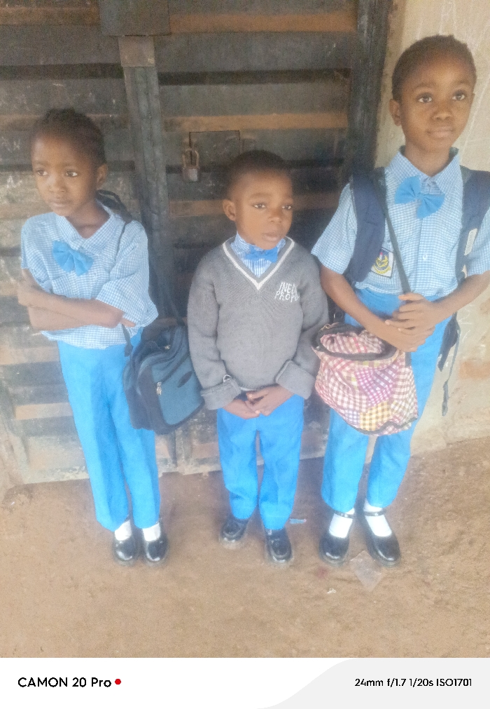 Three children stand facing forward outdoors, positioned against a weathered dark brown wooden plank wall or door featuring a visible padlock on the upper right side. The ground consists of reddish-brown dirt. From left to right: 1. A young girl, approximately 6-8 years old, with dark skin and braided dark hair, stands with her arms crossed. She wears a light blue and white small-checked short-sleeved shirt with a light blue bow tied at the collar, light blue trousers, white socks, and black strap shoes. A dark blue shoulder bag with a lighter blue front pocket hangs on her left side. Her gaze is directed slightly to her left. 2. A young boy, approximately 4-6 years old, with dark skin and short dark hair, stands with his hands clasped in front of him. He wears a grey V-neck sweater over a light blue and white small-checked collared shirt with a light blue bow. The sweater has partially visible white lettering on the chest, appearing to read "INEN PROPO". He wears light blue trousers and black lace-up shoes. His gaze is directed slightly to his right. 3. A young girl, approximately 8-10 years old, with dark skin and short dark hair, stands with her hands clasped in front of her. She wears a dark blue backpack on her shoulders and a light blue and white small-checked short-sleeved shirt with a light blue bow. She also wears light blue trousers, white socks, and black strap shoes. A multicolored shoulder bag with a red, white, and blue checkered pattern hangs from her right shoulder. Her gaze is directed forward. The image was captured with a CAMON 20 Pro at 24mm f/1.7, 1/20s, ISO1701. The precise location within the city of Markurdi, Nigeria, cannot be determined from the visual information provided.