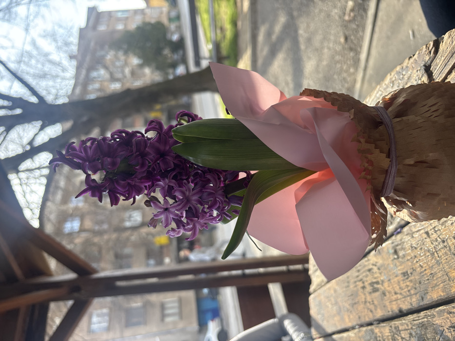 - "A purple hyacinth plant in bloom, exhibiting multiple florets, is presented in a pot wrapped with a layer of bright pink tissue paper over an outer layer of light brown, textured paper, secured by a light-colored string" by FM-V9g653, licensed under CC BY 4.0