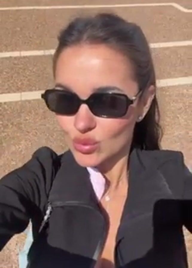 A woman with sunglasses takes a selfie in a plaza. She has dark hair pulled back and is wearing a black jacket over a light pink top, and a delicate pearl necklace. The plaza is paved with rectangular stones, and a modern building is visible in the background. The sky is blue with a few clouds. The woman smiles at the camera.