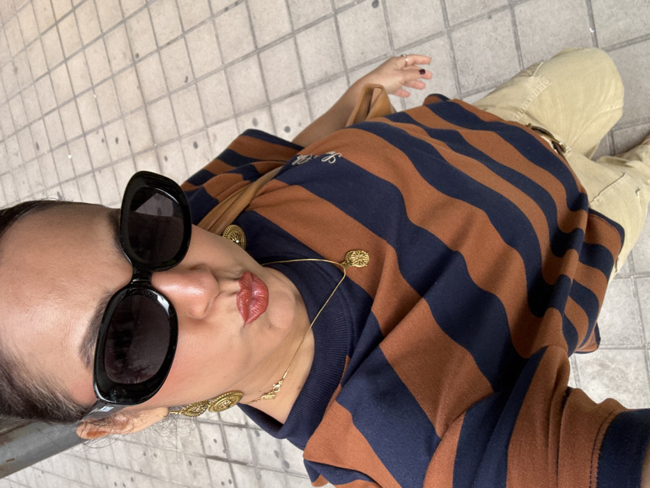 A person is captured in a mid-shot selfie on a paved sidewalk in the city of Mislata, Spain. The individual, facing the camera with lips pursed in a pout, wears dark oval sunglasses, obscuring their eyes. Visible features include dark hair pulled back, rosy blush, and reddish-brown lipstick. They are adorned with large, circular, gold-toned dangle earrings featuring an intricate design, and a thin gold-toned necklace with a matching circular pendant. The subject wears a short-sleeved top with navy blue and rust orange horizontal stripes, featuring a white embroidered symbol on the upper left chest. A brown shoulder bag strap is visible over their right shoulder. Light beige cargo-style pants are worn, secured with a brown belt. A gold-toned ring is present on the right ring finger, and dark nail polish on the visible fingernails of the right hand. The background consists of a light-colored tiled pavement with a grid pattern, and a dark vertical pole or column is partially visible on the far left.