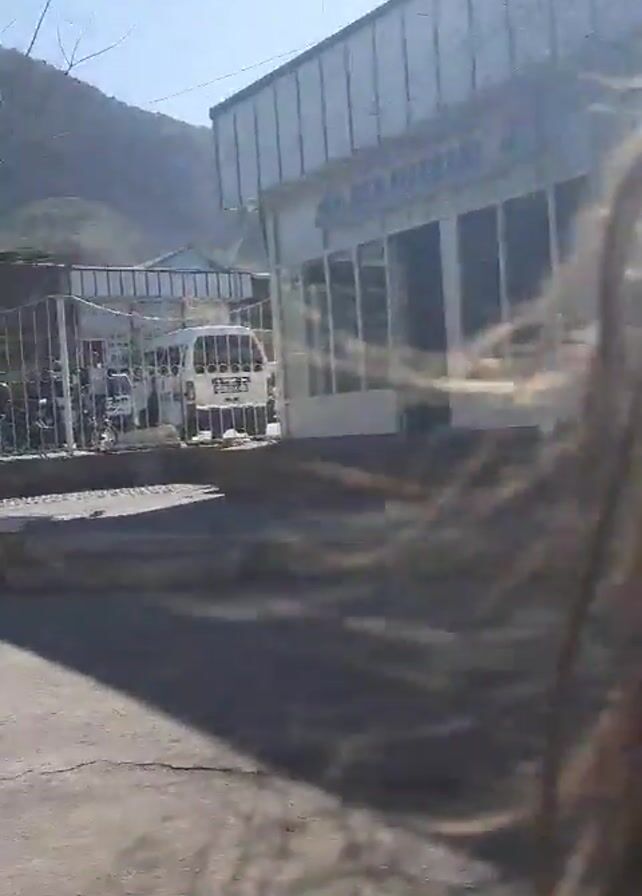 young girl walking towards the camera. She has brown hair pulled back in a ponytail and is wearing a white long-sleeved shirt with black stars and black pants. The girl is on a paved area, and behind her is a building with a fenced-in area. In the background, there is a mountain, a car, and some trees.