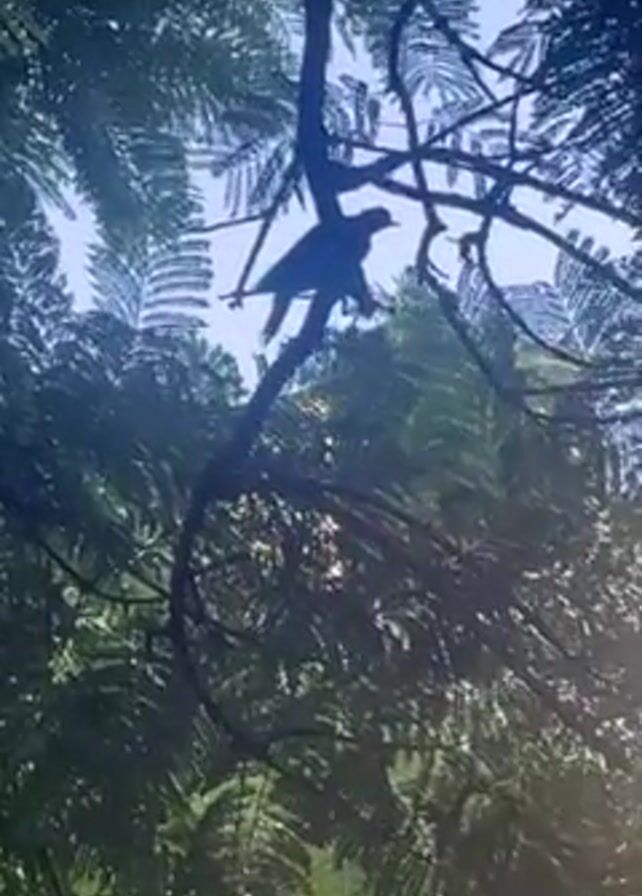 low-angle view looking up into the dense canopy of a tree. A bird is perched on a branch, silhouetted against the bright sky. The tree's leaves appear fern-like. Patches of sunlight filter through the foliage.