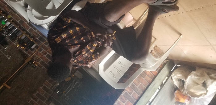 A male individual with a dark complexion and short, dark hair is seated on a white plastic chair indoors, leaning forward. He is wearing a short-sleeved, brown, black, and yellow plaid shirt and dark shorts, with a dark-colored sandal visible on his right foot. The backrest of the chair is embossed with the text "God Bless You." The individual is engaged in manipulating multiple small, golden-colored, cylindrical objects, possibly hardware components, using a small, silver-colored tool, resembling pliers or a wrench, in his hands. The floor is covered with light-brown square tiles. To the left of the seated individual, two light-colored sacks and an orange and white plastic bag rest on the floor. The background features a brick-patterned wall, against which brass-colored piping and electrical wiring are visible. Above the individual's head, a shelf or storage unit displays various metallic and mechanical components. A large, white, circular object is partially visible on the far right of the frame. The scene is illuminated by ambient light. Location: Unknown, Unknown.