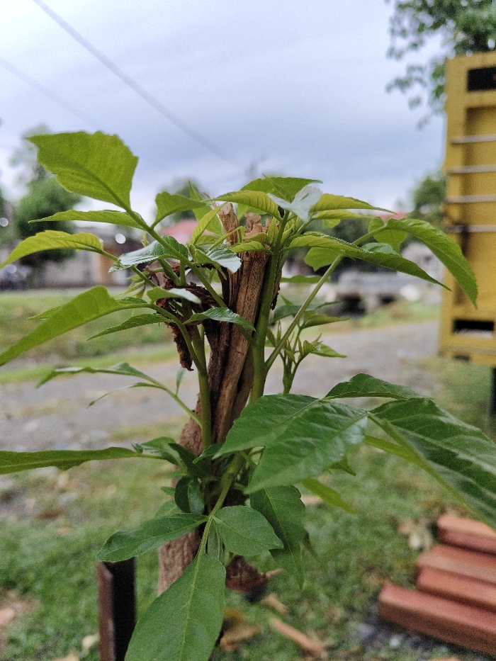 The image depicts a close-up, ground-level view of a nascent plant featuring multiple green leaves emerging from a central, brown, woody stem. The stem exhibits evidence of a prior cut, with new growth sprouting from the upper portion. In the immediate foreground, to the lower right, a partial stack of reddish-brown bricks rests on ground covered by green grass and sparse dirt. The background is out of focus, revealing an indistinct paved or dirt path, with blurred green foliage and trees in the mid-distance. To the far right, a vertical section of a yellow structure is visible. The sky is overcast with a uniform grey cloud cover. No individuals, animals, or specific actions are discernible. The scene is located in Jurong Pante, Indonesia.