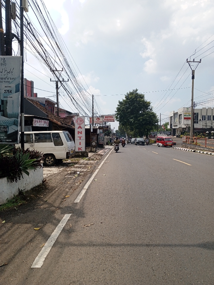 This image depicts a daytime street scene in the city of Multhan, India. A two-lane asphalt road extends from the foreground into the background, under a partly cloudy sky. On the left side of the road, a dirt shoulder fronts a series of commercial buildings and utility infrastructure. A tall banner with text including "RESTAURANT jual promo" and "275K" is visible near the foreground. A white minivan is parked on the shoulder, adjacent to a vertical sign displaying the word "ANTIK" in red capital letters. Further down the street on the left, a prominent horizontal sign reads "HOTEL MEKAR MULYA". Numerous entangled utility wires crisscross overhead, supported by multiple wooden and concrete poles. A large green tree stands prominently in the mid-ground. On the right side of the road, a concrete median strip with black and white striped curbs separates the street from an unseen area. Vehicles, including multiple motorcycles, a red compact van, and at least one car, are present on the road, moving away from the viewer in the mid-distance. Buildings with light-colored facades are visible on the right side of the street further into the background.