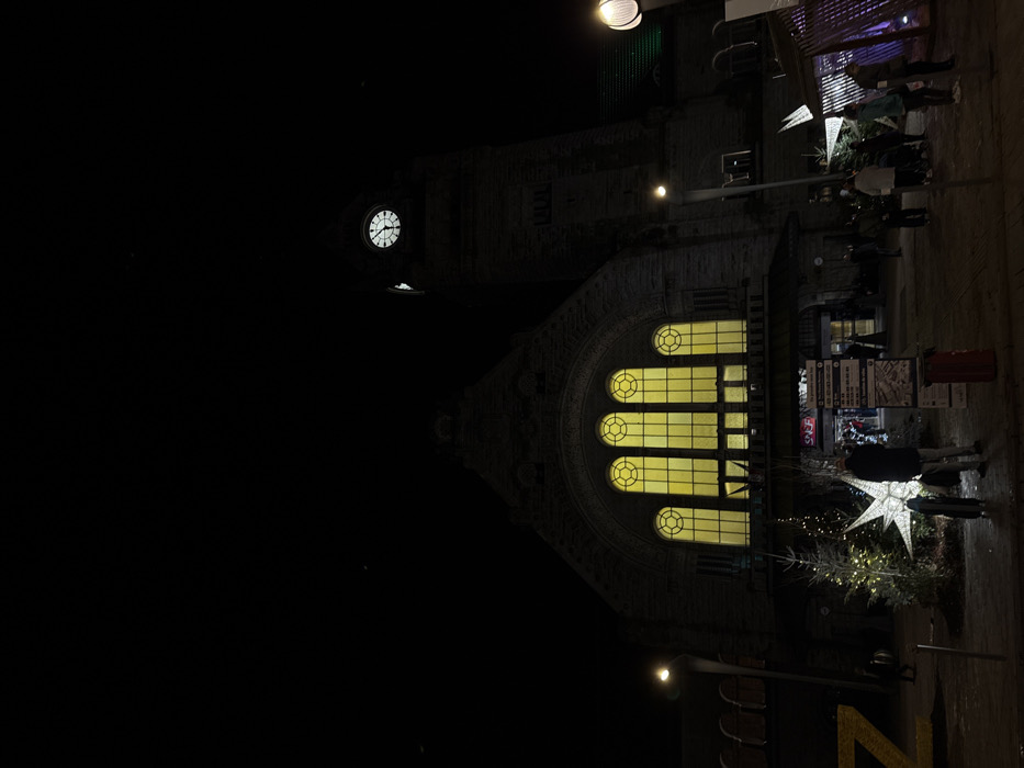 A night scene features a building with illuminated windows and a clock tower. The windows glow with a yellow hue, while the clock face is brightly lit. Figures of people stand on the right side of the building near a decorative star. A streetlight shines above, casting a glow over the scene. The background is dark, contrasting with the illuminated elements.