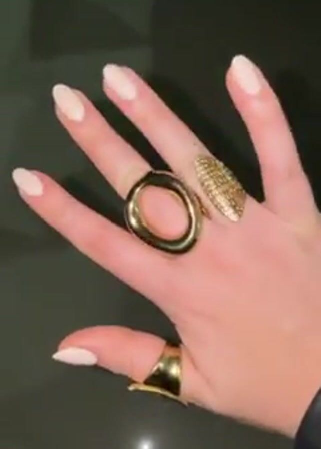 person's hand adorned with multiple gold rings. The rings vary in style, including an open oval ring, a textured, leaf-shaped ring, and a wide band ring. The person has pale pink nail polish. The background appears to be a dark, reflective surface. Another set of gold rings with a turquoise stone and curved band are presented as well.