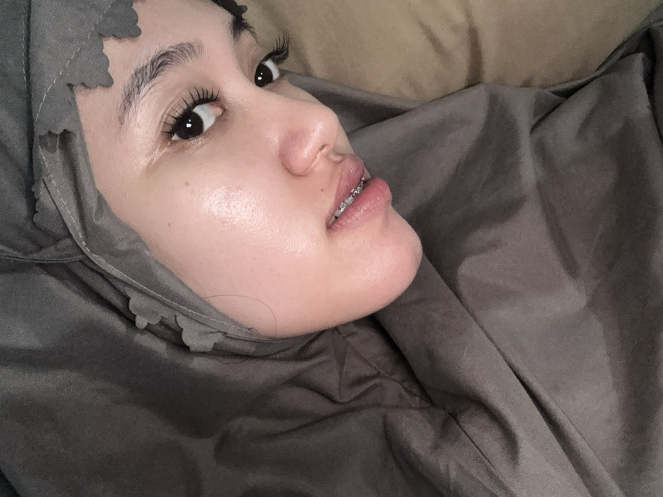 A close-up, angled portrait depicts a young female indoors. The individual, positioned from the shoulder up, has fair skin with a visible sheen, dark eyes with prominent eyelashes, and well-defined eyebrows. She wears a grey head covering, possibly a hijab, featuring a scalloped edge along the facial opening. Dental braces are visible on her upper teeth. Her head is tilted, and her gaze is directed towards the camera. The background appears as a soft, light brown/tan fabric, consistent with bedding or upholstery. The specific location within the city of Gadingrejo, Indonesia, cannot be visually confirmed from the image data.
