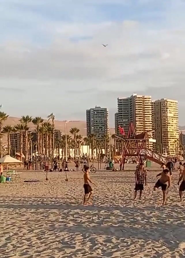 beach scene during the day. Several shirtless young men are playing with a ball on the sand. Other people are walking or relaxing nearby. A row of palm trees separates the beach from a street with buildings and businesses. There are a few tents and umbrellas set up on the beach. The sky is mostly clear with some clouds. A bird is flying in the distance.