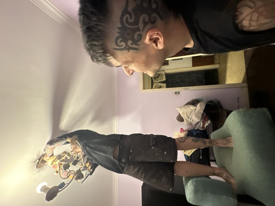 A person stands beside a green armchair, wearing a black t-shirt and shorts. Their legs are extended, revealing tattoos. A decorative, lit wall sconce is visible near the individual. A second person's head is shown at the top, featuring a distinctive head tattoo. A mirror reflects a room with stacked items, indicating a cluttered space. The background includes a lilac-colored wall.