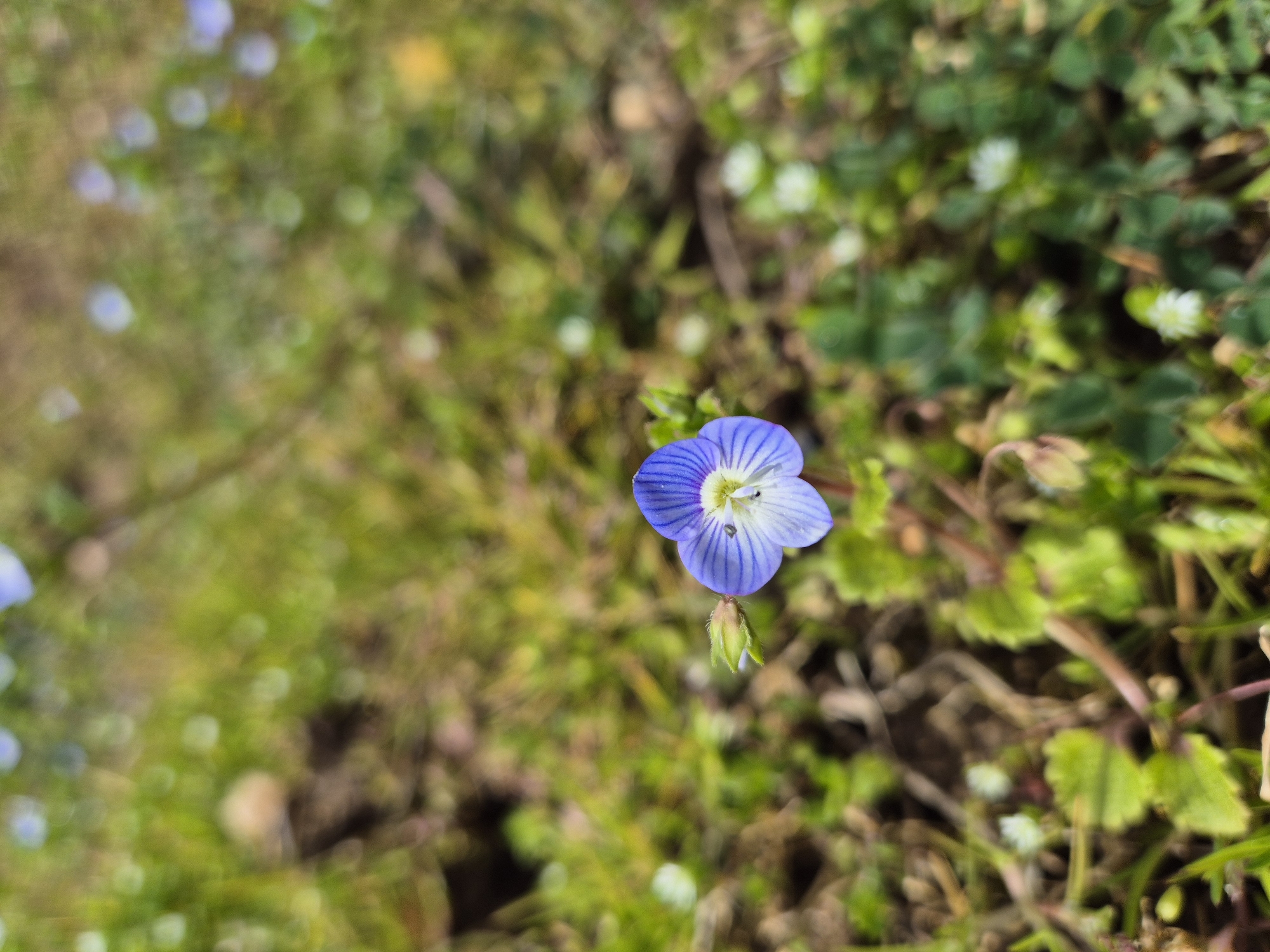 The image displays a close-up view of a single, small flower with four prominent petals, centrally located and in sharp focus. The petals are predominantly blue with distinct darker blue linear venation, transitioning to a white area at the center, which contains a small yellow and white structure. A small, unopened, light green bud is visible on a thin stem immediately to the left of the main flower. The ground-level environment surrounding the flower consists of various green plant foliage, blades of grass, and exposed patches of dark brown soil. Elements in the foreground and background are significantly blurred due to shallow depth of field, with indistinct shapes and light reflections suggesting additional plant life. The scene is illuminated by natural light. This botanical element is situated in Zvezditsa, Bulgaria.