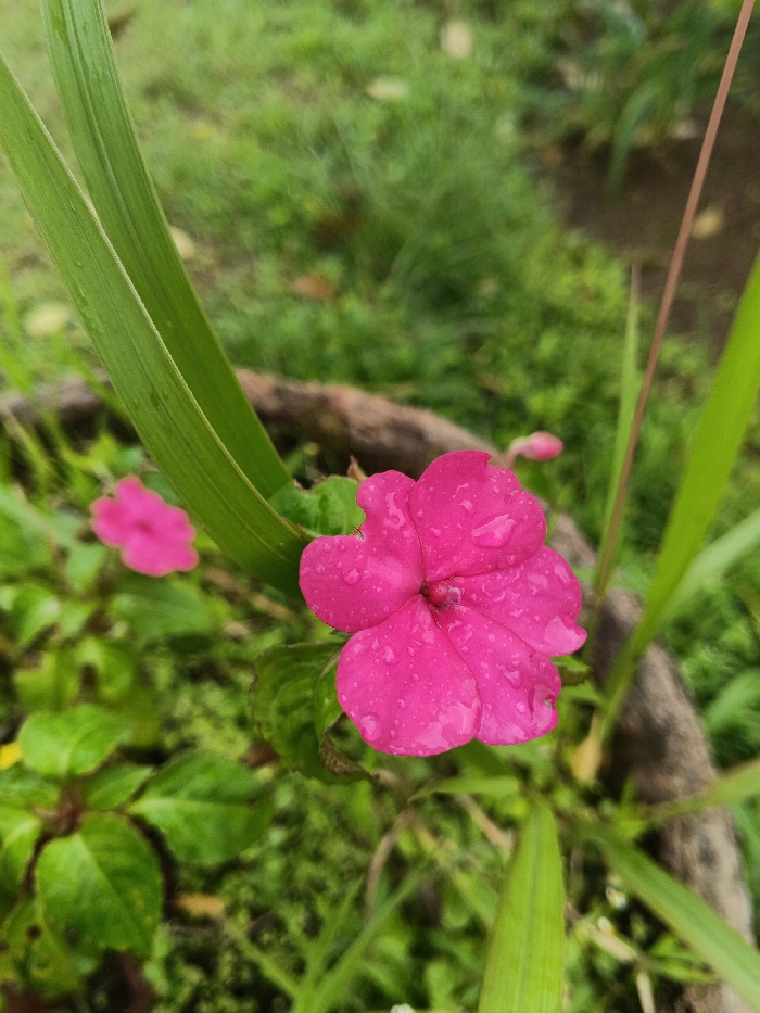 The image displays a close-up view of a vibrant fuchsia-colored flower, centrally positioned and covered in numerous small water droplets. This main flower features five distinct petals and a visible darker center. To the left, slightly out of focus, a second fuchsia-colored flower is present. A small, unopened fuchsia flower bud is also visible to the upper right of the primary flower. The flowers are surrounded by various green plant elements. Long, narrow, blade-like green leaves, some also bearing water droplets, are prominent in the foreground and mid-ground. Denser, broader green leaves form the base around the flowers. A dark, irregularly shaped object, possibly a piece of wood or a section of a planter, is visible in the mid-ground, partially obscured and out of focus. The background consists of a blurred expanse of green vegetation, consistent with a garden or natural outdoor setting. The lighting is natural and diffused. No human subjects or distinct actions are depicted. The specific location within Ho Chi Minh City, Vietnam, cannot be determined from the visual information provided in the image.
