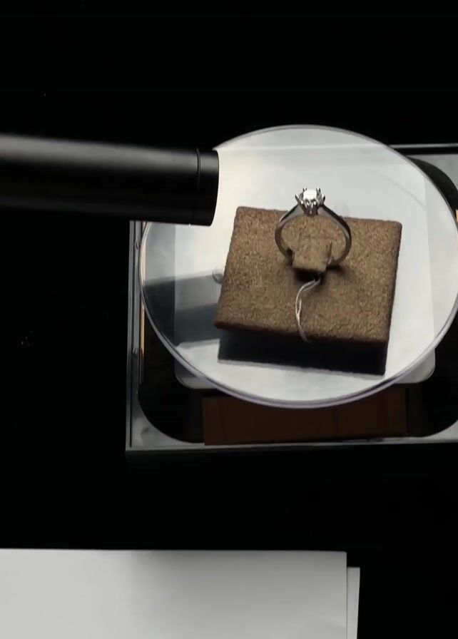 A man is adjusting a camera mounted on a tripod. He is in a dark room with a softbox providing light. In front of him on a table is a small platform with a ring on a cushion. A white sheet of paper is also on the table. The man is wearing a plaid shirt and has a beard.