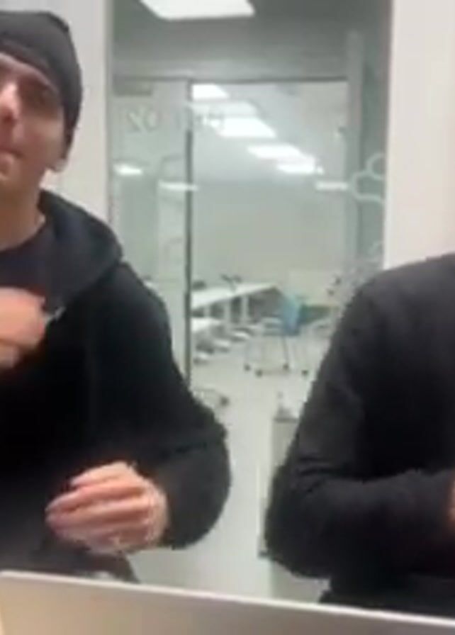 Two men in a brightly lit office space stand side-by-side in front of a desk where a laptop sits. Both are wearing dark clothing and hats; the man on the left has a beanie, while the one on the right has a baseball cap. They are both smiling and performing a synchronized dance, rubbing their chests and shoulders. Behind them is a glass-enclosed room with tables and chairs, and a whiteboard is visible to the right. The audio includes a pop song with a Latin beat.