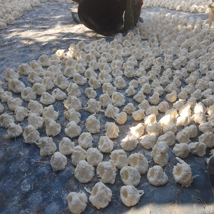 In Sabongari Garkida, Nigeria, an outdoor scene depicts numerous irregularly shaped, white, granular or fibrous masses spread extensively across a dark blue ground covering