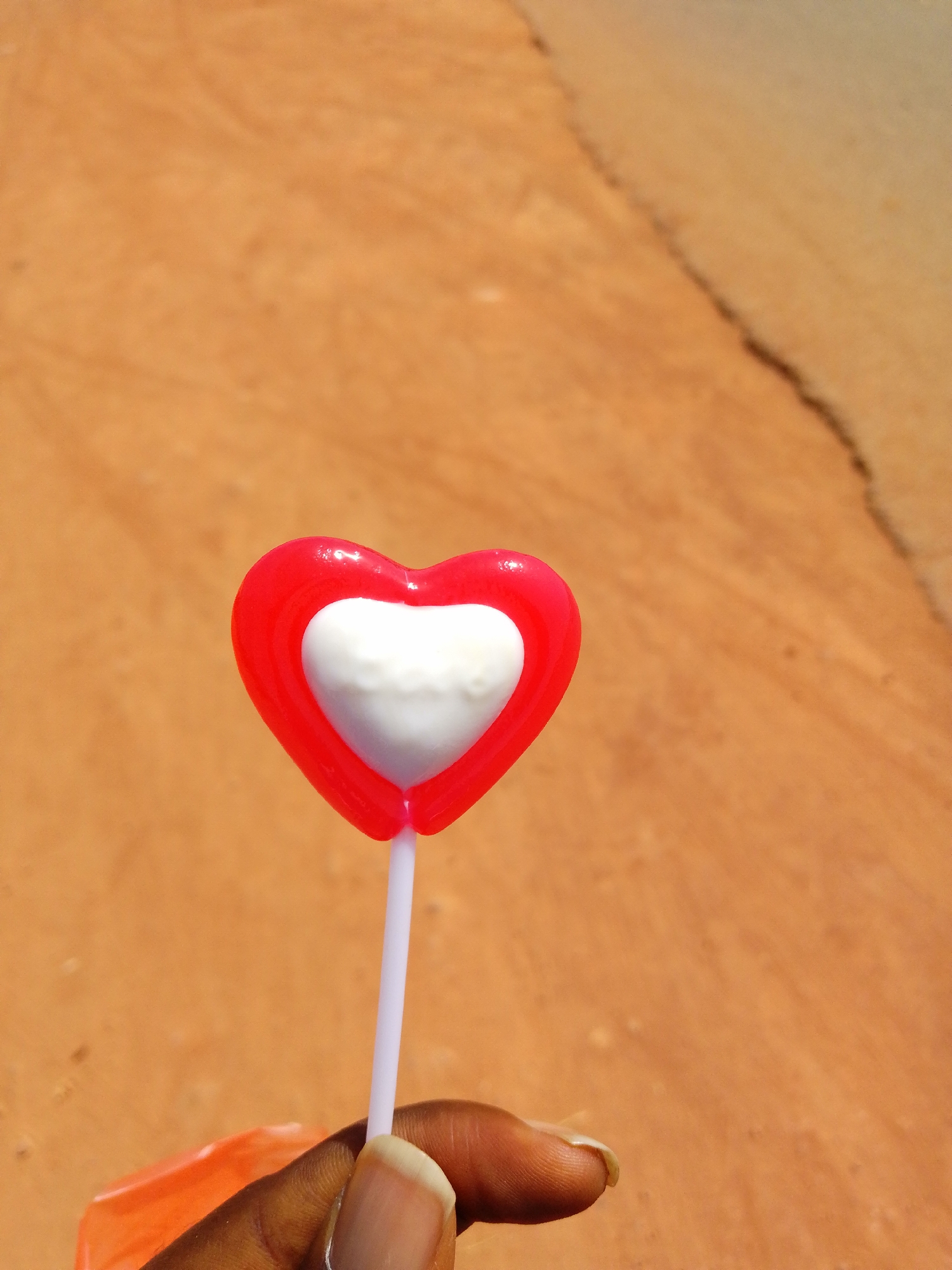 A close-up photograph depicts a human hand holding a heart-shaped lollipop against a blurred, reddish-brown earthen background, specifically located in Bukuru, Nigeria. The lollipop features a prominent, translucent red outer heart layer encasing a smaller, opaque white inner heart. It is affixed to a slender, opaque white plastic stick. The visible hand, positioned in the lower right quadrant, exhibits a dark skin tone; the thumb and index finger are actively gripping the white stick. The fingernails are natural and unpolished, with a minor discoloration present beneath the thumb's nail. A partially visible, out-of-focus orange object, possibly a wrapper fragment, is present beneath the hand. The background displays a uniform, soft-focus texture consistent with dry soil or an unpaved surface, with a faint, dark, diagonal fissure visible in the upper right. The scene is illuminated by bright, natural light.