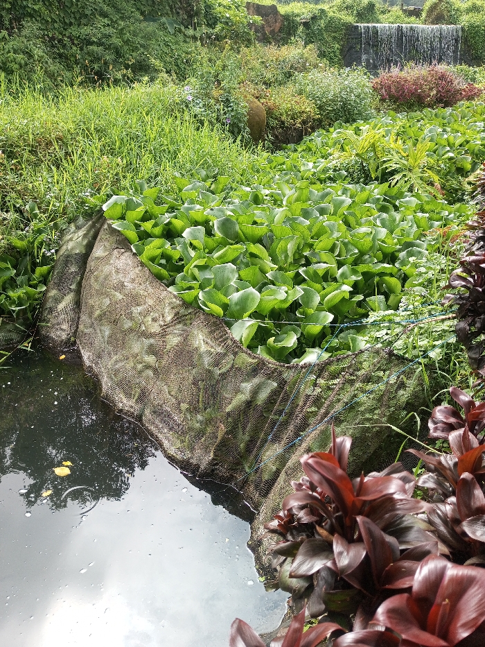 The scene depicts a verdant garden or park landscape within the city of Nuwara Eliya, Sri Lanka. The foreground features a section of dark, reflective water on the left, displaying reflections of an overcast sky and surrounding foliage. Several small, yellow floral or leaf debris float on the water's surface, alongside discernible water droplets suggesting recent precipitation. To the right, a cluster of deep reddish-brown foliage, consistent with Cordyline plants, partially frames the lower right corner. A dark green, open-weave net barrier extends diagonally across the midground, separating the open water from a dense mass of bright green water hyacinth (*Eichhornia crassipes*) that dominates the central midground. The water hyacinth covers a significant portion of a contained water body, with numerous round to oval leaves visible. To the left of the water hyacinth, an area of taller, light green grass grows, bordered by a large, dark-colored rock embedded in the vegetation. Behind the water hyacinth and grass, various shrubs and plants, some with reddish-brown leaves, contribute to the dense greenery. In the background, a man-made waterfall cascades down a dark, textured rock face, with white water visibly flowing. Above and around the waterfall, a hillside is covered in abundant green foliage, indicative of a lush, possibly tropical, environment. No individuals or specific actions are observed.