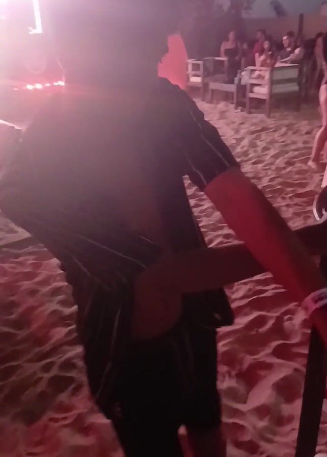 A person wearing a black and white striped shirt appears to be dancing on sand in an outdoor or partially covered event space