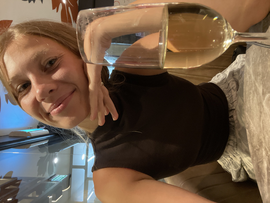 A single fair-skinned female individual is depicted in an indoor commercial establishment in Choeng Thale, Thailand. She is smiling directly at the camera with her head tilted slightly to the left, her left hand resting beneath her chin, displaying a ring on her left ring finger. She wears a dark, sleeveless, high-necked top and light-colored patterned shorts or trousers. In the right foreground, a champagne flute containing a pale yellow, effervescent liquid is placed on a light-colored table surface. The background includes a tan upholstered chair, reflections of blue and white overhead lighting on a glass or mirrored surface, a red and white abstract pattern on a wall, and a distant green illuminated 'EXIT' sign.