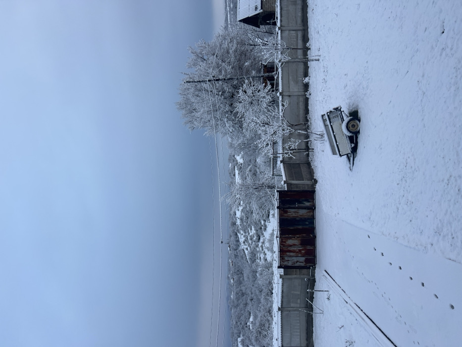 A winter scene features a snow-covered landscape under a cloudy sky. Trees laden with snow line a fence dividing a yard. Footprints mark the snow-covered ground, leading away from a small trailer. Beyond the fence, a snow-blanketed hillside descends towards what appears to be a body of water or a distant horizon. The structures visible, including part of a building and the fence, are also covered in snow.