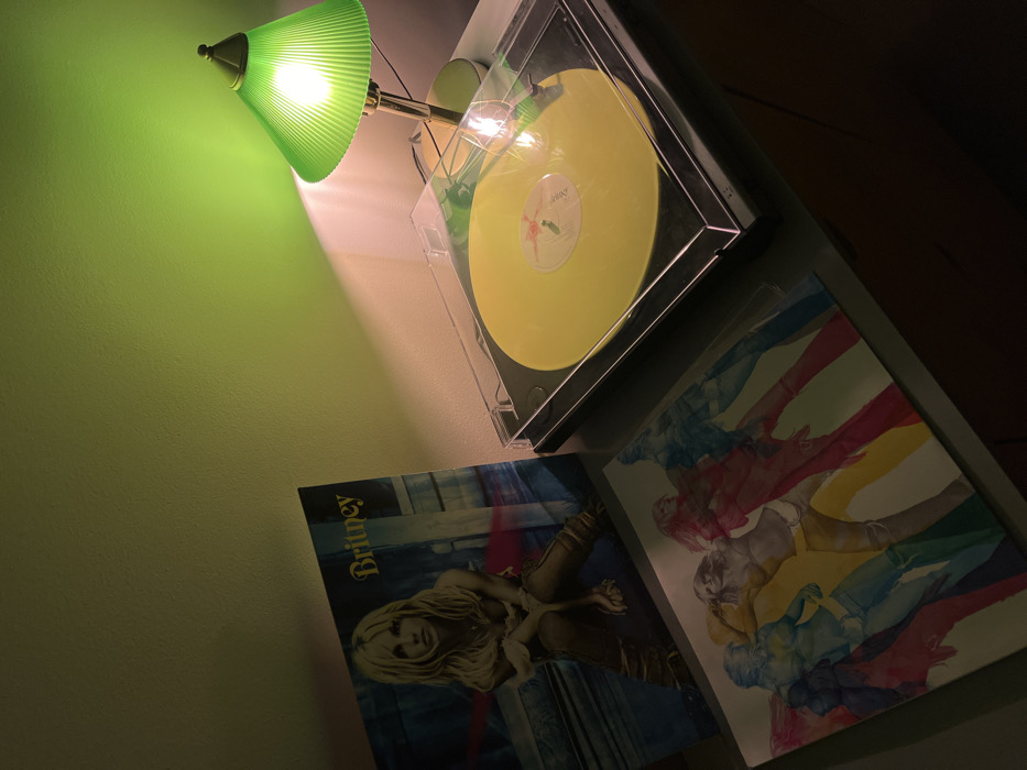 A green lamp illuminates a collection of records. A yellow vinyl record, encased in a protective frame, sits above two album covers. One features Britney Spears; the other shows figures in varying shades of blue, yellow, red, and white. The setting appears to be a shelf or wall display, with a dark background behind the records and lamp.