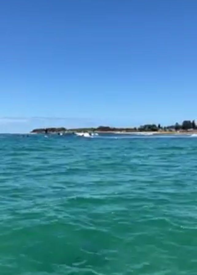 view of the sea under a clear blue sky on a sunny day. The water is a vibrant turquoise color with small waves rippling across the surface. In the distance, there is a coastline with a beach, some greenery, and what appears to be buildings. Several people are visible in the water near the shore, some of whom seem to be engaged in water sports like surfing or stand-up paddleboarding.