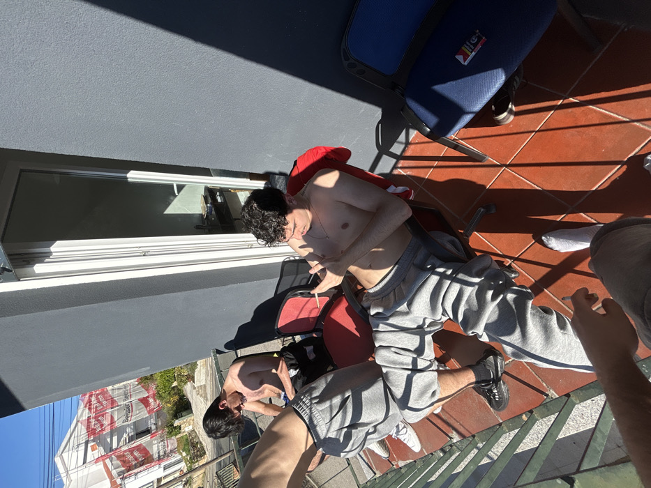 The image displays an outdoor balcony scene in Bragança, Portugal, under direct sunlight, casting sharp shadows across the orange-red tiled floor. Three shirtless males are visible. In the mid-ground, one male with dark, curly hair is seated on a red chair, wearing grey sweatpants and black athletic shoes; he holds a lit cigarette between his fingers, looking downwards. To his left, the lower torso, arm, and legs of a second male are partially visible, wearing grey sweatpants and white athletic shoes. In the background, a third male is seated on another red chair, wearing black shorts and looking downwards. An unoccupied blue chair is situated on the far right. The balcony features dark grey walls and a partially open white door leading indoors on the right. Beyond the left railing, an urban environment is visible, including a multi-story building under construction, clad in white tarpaulins with "Beissier" branding, beneath a clear blue sky crisscrossed by utility lines.