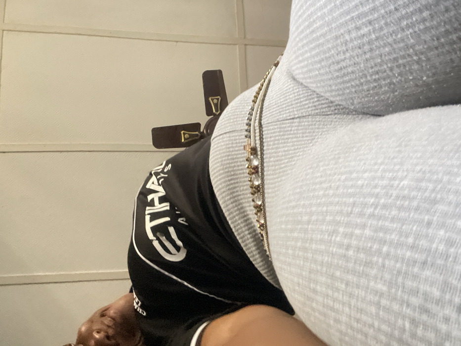 An interior, low-angle photograph captures an individual, likely female, reclining or lying down. The upper left portion of the frame shows the person's face (forehead, eye, nose, and cheek) with dark skin and short, dark hair, looking upwards and to the left. The subject is wearing a black short-sleeved t-shirt with "ETIHAD AIRWAYS" printed in white on the front, featuring a white curved stripe design. Light grey, ribbed leggings are worn on the lower body. Multiple strands of waist beads, composed of metallic, clear, and reddish beads, are visible around the midsection, resting above the leggings. The background features a plain, light-colored wall with vertical paneling. To the right of the subject, partially obscured, is a dark brown furniture component with two visible sections containing gold-colored decorative fittings. The image provides no discernible features to confirm the specific location within Ajaokuta, Nigeria.
