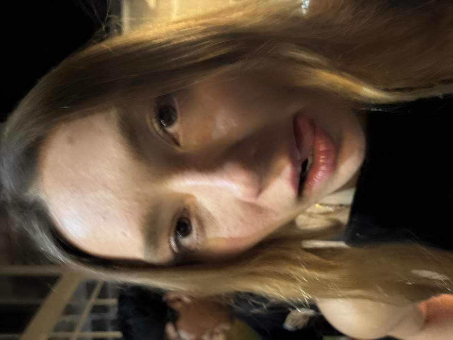 A person with long blonde hair poses for a close-up shot, tilted to the side
