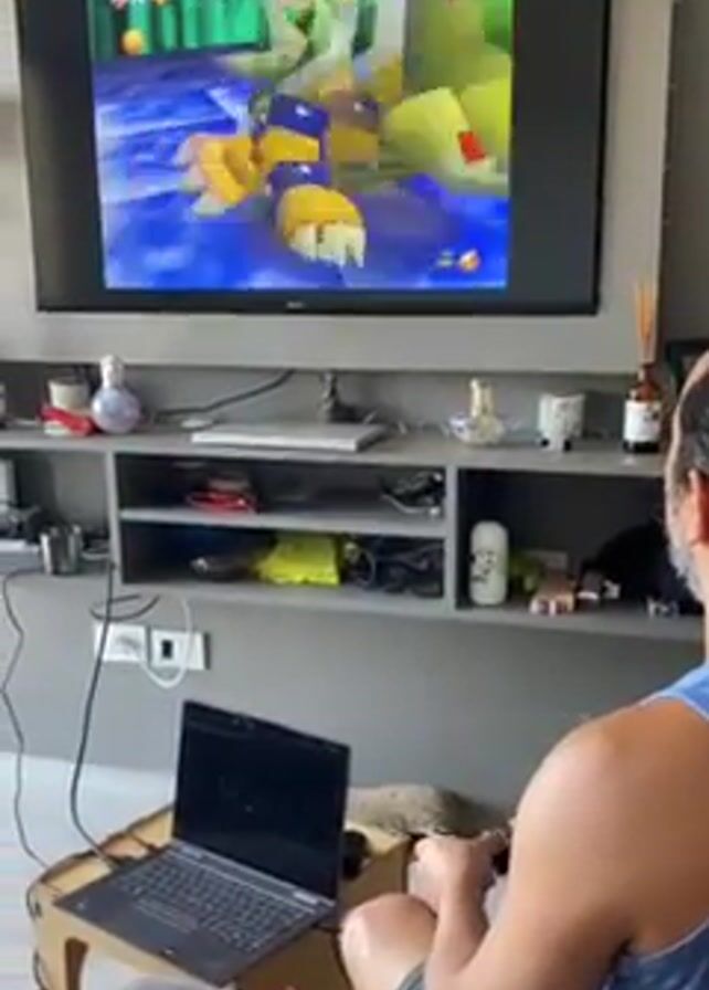 Here’s a concise description of the video: The video shows a man playing a video game on a large TV screen. He is seated on a couch and holding a game controller. A laptop sits on a table next to him. The game appears to be Super Mario 64, and the character is in an underwater level fighting a large yellow enemy. The room has a modern aesthetic with a gray entertainment center and various decorative objects. The lighting is bright.