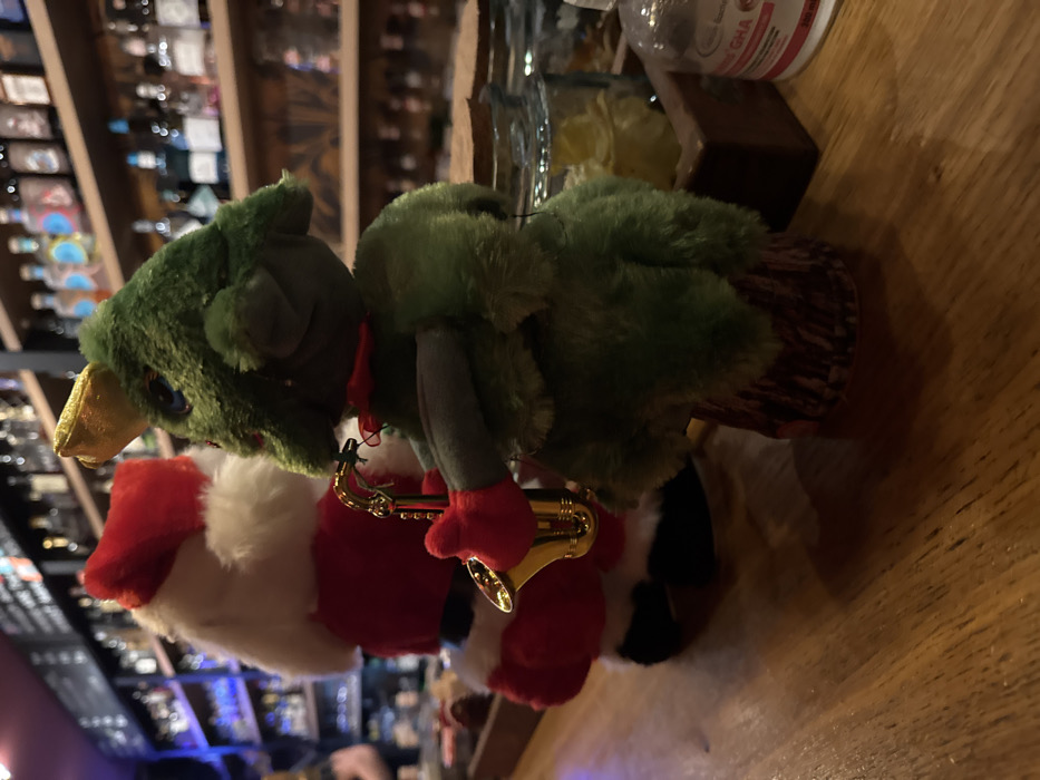 A plush toy of Santa Claus playing a golden saxophone supports another plush figure dressed as a Christmas tree. The toy rests on a wooden surface, possibly a bar top. The background features rows of bottles, suggesting a bar or liquor store. A glass, a brown box, and a white bottle with a red label are also visible on the surface next to the toy.