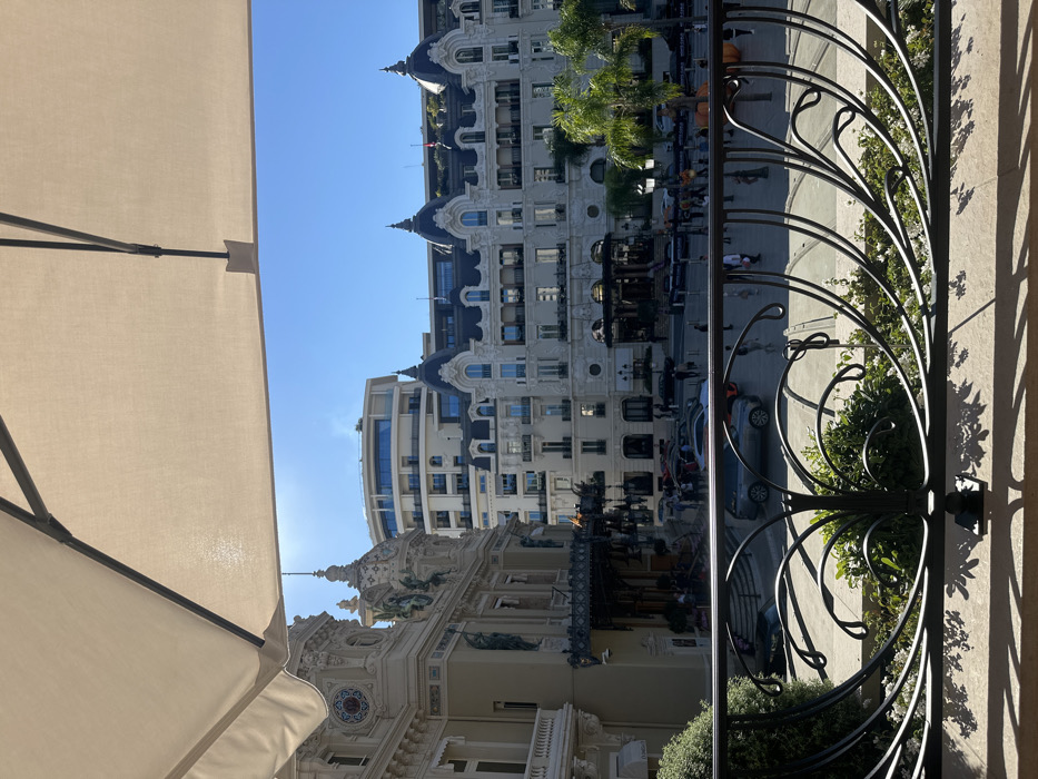 The image depicts Casino Square (Place du Casino) in Monte Carlo, Monaco, viewed from an elevated position, likely an outdoor terrace. A beige outdoor umbrella is partially visible in the top left, and a decorative black wrought-iron railing with scrollwork spans the bottom of the frame, positioned above a stone ledge with green foliage and white flowers. On the left, the ornate Beaux-Arts style Monte Carlo Casino building is prominent, featuring light-colored stone, classical architectural elements, statuary, and a grand entrance with a canopy and steps. Directly across the square, the elegant Hôtel de Paris Monte-Carlo stands, characterized by its multi-story classical facade and distinctive dark, pitched roofs with dormers. In the far background, to the center-left, a modern, curved building with a light-colored facade and extensive glazing is visible. The square itself is paved and populated by numerous individuals walking and standing. Several luxury vehicles, including a silver SUV, are present on the paved areas. Palm trees are visible on the right side of the square. The scene is illuminated by bright sunlight under a clear blue sky, casting distinct shadows.
