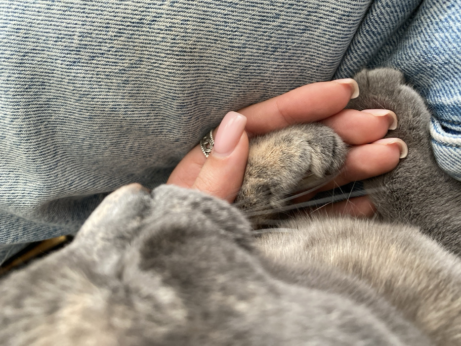The scene, located in the city of Björklinge, Sweden, depicts a close-up view of a human hand interacting with a domestic cat. A human right hand, featuring light pink manicured nails and a silver-colored ring with an intertwined design on the fourth finger, is positioned around a gray and light brown cat's paw. The cat's head, primarily gray fur, is partially visible and out of focus on the left side of the frame. The background consists of blue denim fabric, likely clothing worn by the human, visible on the right.