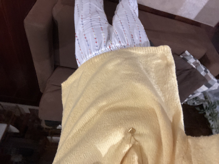 The image displays an individual, visible from the upper torso to the lower legs, standing within an indoor residential setting. The specific city and location are unidentified. The person wears a light yellow, V-neck, long-sleeved top with a textured knit, and white trousers patterned with vertical rows of small red and blue dashes. A gold-toned chain necklace with a heart-shaped pendant is visible around the neck. The background features a brown sofa, positioned to the left, upon which rest two cushions: one solid dark brown and another with a brown and light-colored plaid pattern. A portion of a green potted plant is visible to the far left, behind the sofa. A light-colored rug or carpet partially covers the floor in the foreground. The lighting within the scene is internal and appears dim. No specific actions or interactions are depicted beyond the subject standing.