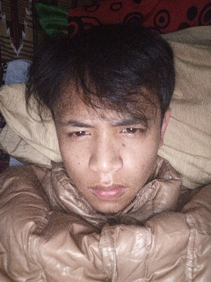 A person wearing a shiny brown jacket lays on a tan pillow. The person has dark hair, a serious expression, and their eyes are open. The background includes colorful fabric with varying patterns. The jacket's collar is raised, positioned close to the person's face. The lighting is somewhat dim, casting shadows on the face and jacket.