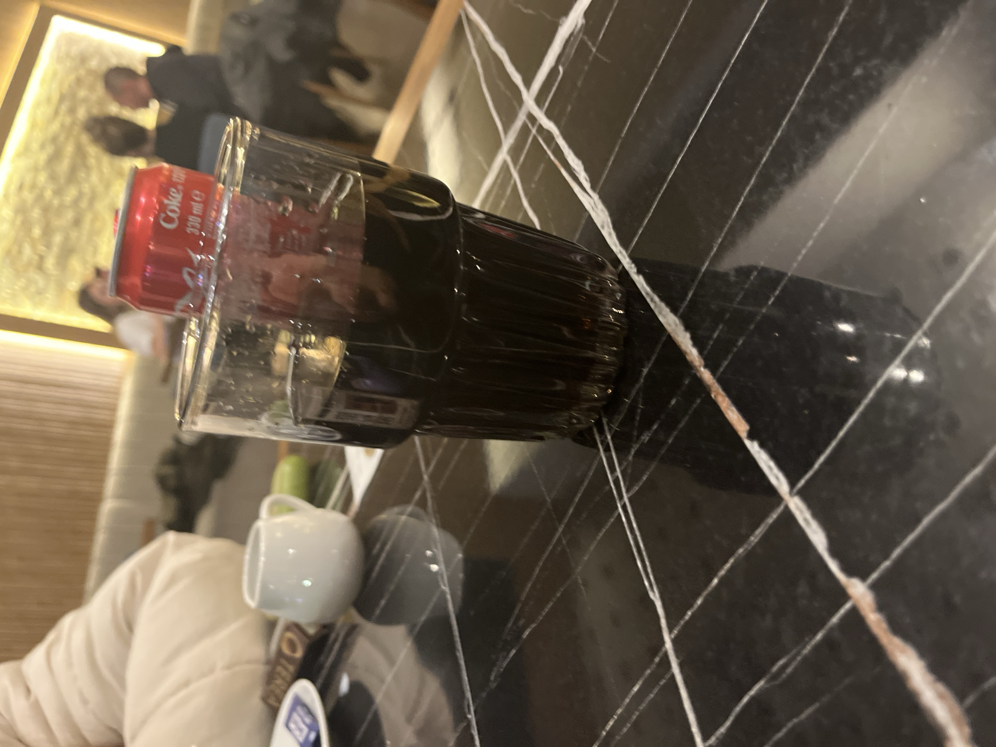 A clear, ribbed glass containing a dark brown liquid is positioned centrally on a reflective black marble table featuring prominent white and reddish-brown veining. A red 330 ml Coca-Cola can is submerged within the liquid inside the glass. To the left of the glass, a small white ceramic pitcher with a handle rests on the table, alongside a partially visible white ceramic plate and a dark rectangular object, possibly a menu or placemat. A person wearing a cream-colored, puffy jacket is partially visible in the upper left background. The blurred background reveals an indoor dining establishment with multiple indistinct figures seated, suggesting patrons. The environment includes warm ambient lighting, a textured light-colored wall, and a large illuminated rectangular wall panel. The scene is located in the city of Vratsa, Bulgaria.