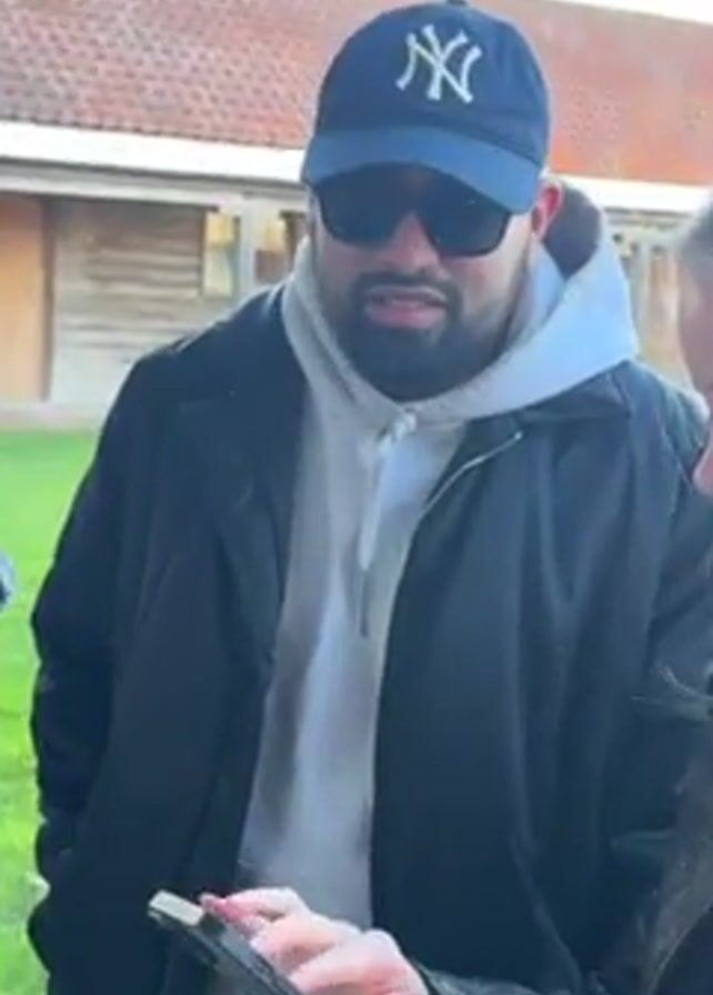 A video depicts a man wearing a navy blue New York Yankees baseball cap, sunglasses, a grey hoodie, and a black jacket standing beside a woman
