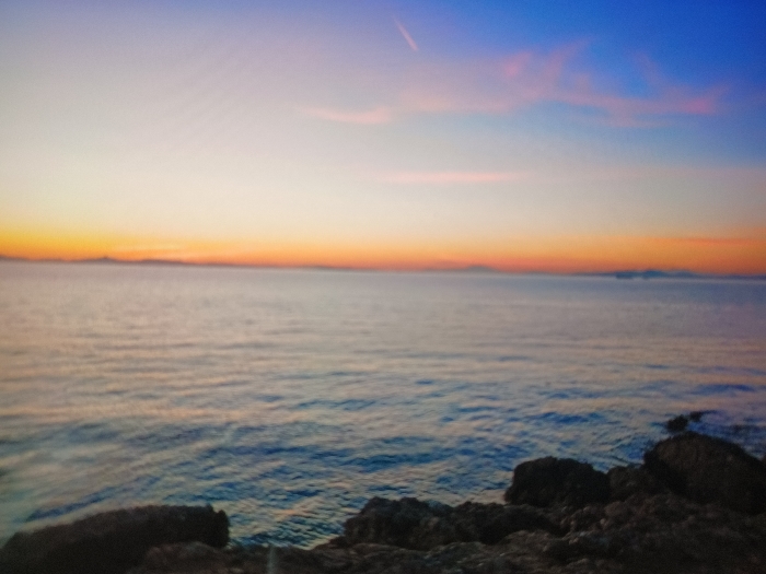 The image captures a twilight coastal scene, likely a sunset, from a rocky vantage point along the Athenian Riviera, facing the Saronic Gulf near Athens, Greece. The sky displays a clear gradient, transitioning from deep blue at the top to a vibrant orange and yellow hue along the horizon line. Sparse, wispy pink clouds are visible in the upper sky, with a faint, thin white contrail present in the upper left quadrant. The vast expanse of water below is dark blue with subtle surface ripples, reflecting the fading light. In the immediate foreground, dark, rugged rock formations constitute the shoreline. Along the distant horizon, low-lying landmasses, consistent with islands, are silhouetted against the brighter sky. No human figures, specific man-made structures (other than the distant contrail), or discernible actions are present within the frame.