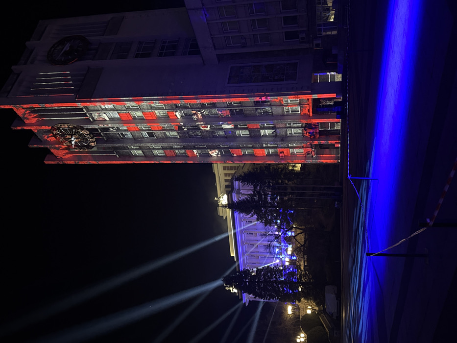This nighttime image captures the central square of Gabrovo, Bulgaria, featuring two prominent municipal buildings illuminated by an elaborate light show